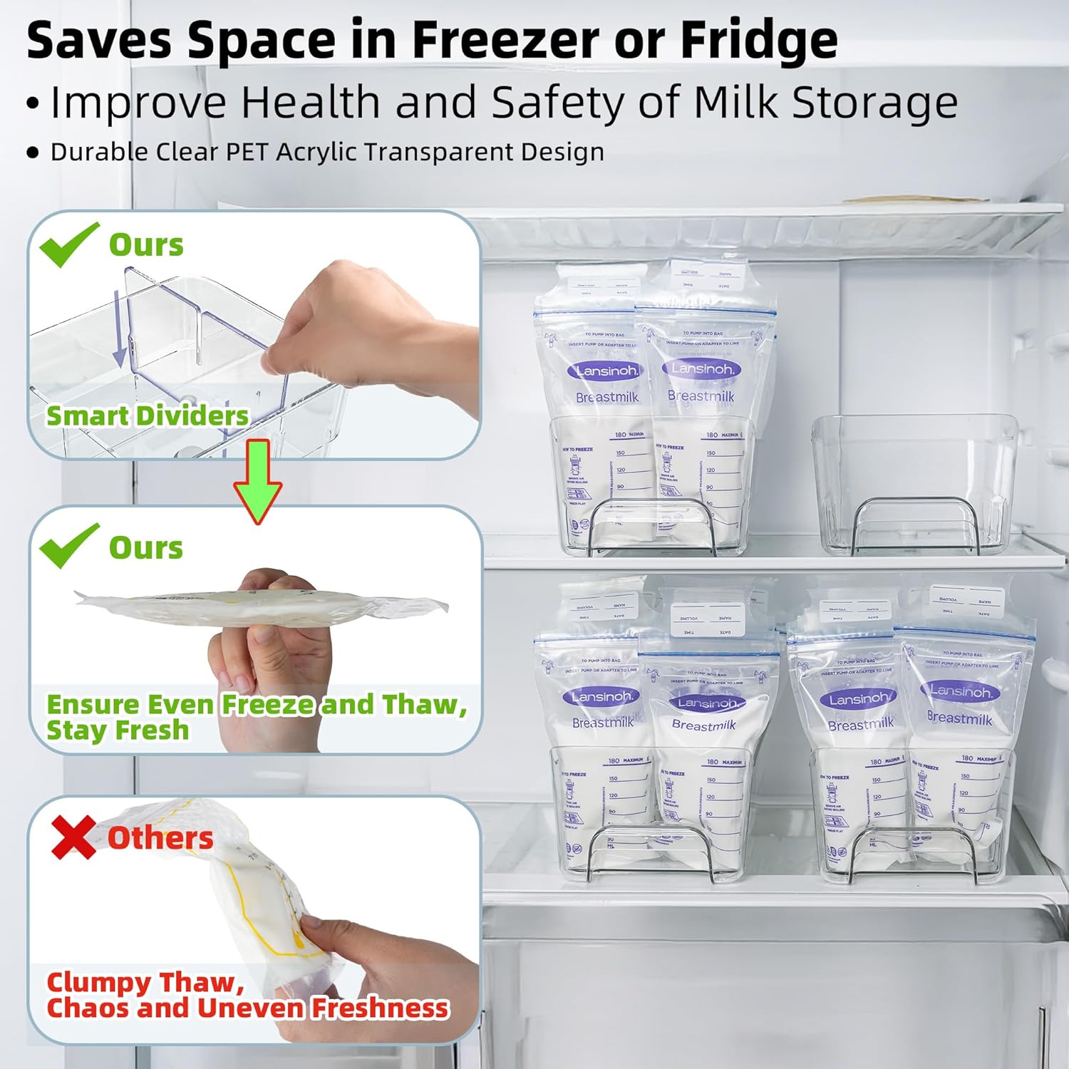 - Durable and Clear Acrylic Transparent - Parents can easily track their stash of frozen labeled breast milk, ensuring proper storage, making it easier to locate feed for little after work. Dividers prevent bags from being damaged or mixed up, maximizes room in the freezer, providing a convenient box way to save large quantities of milk longer while ensuring quick access when needed.